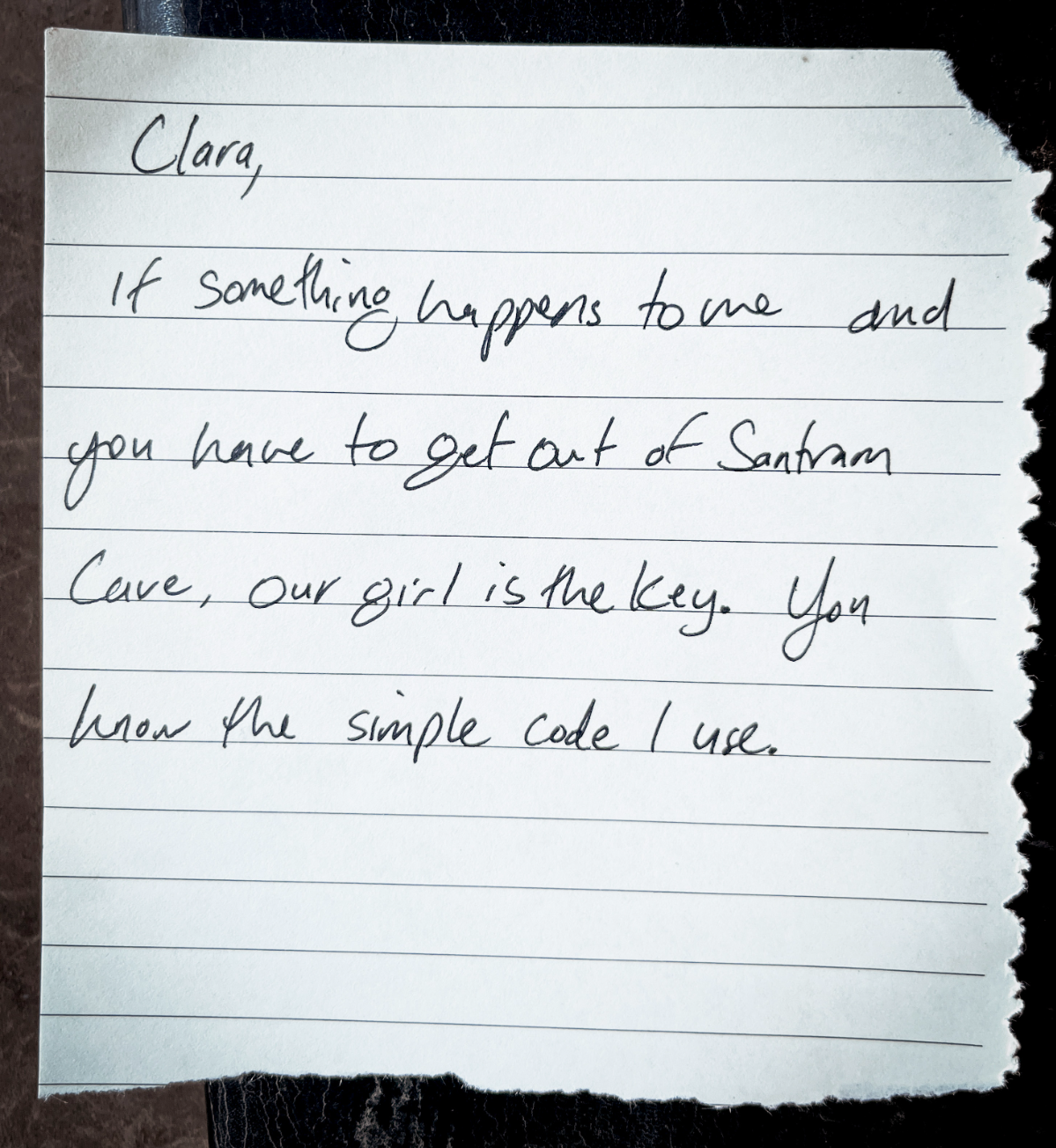 I sort quickly through the papers on the desk, but nothing looks useful. Moving on to the drawers, I notice one seems jammed shut. Convinced it has something worth my time, I pry at it with a pair of scissors and manage to get it open. There is only a small sheet of torn paper with a note on it at the bottom of the drawer.